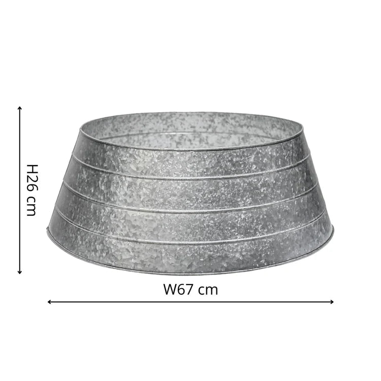 Complete your festive decor with this stylish galvanised metal christmas tree skirt, designed to conceal wires, cables, and twigs seamlessly.