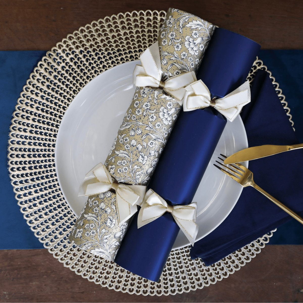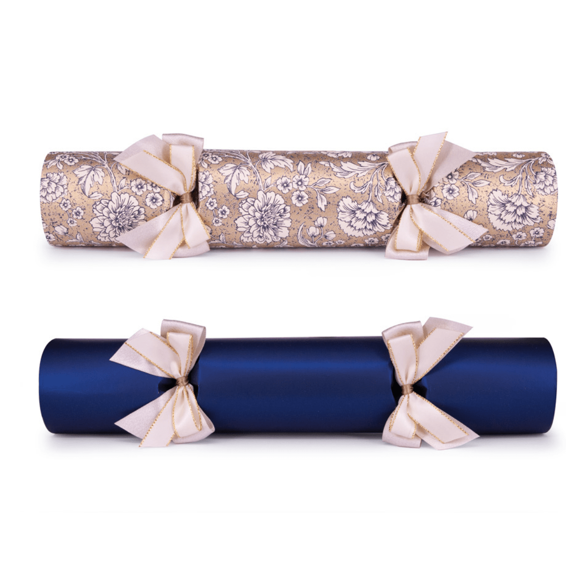 Infuse your table with festive luxury this holiday season with this set of handcrafted blue and gold Christmas crackers, finished in satin.