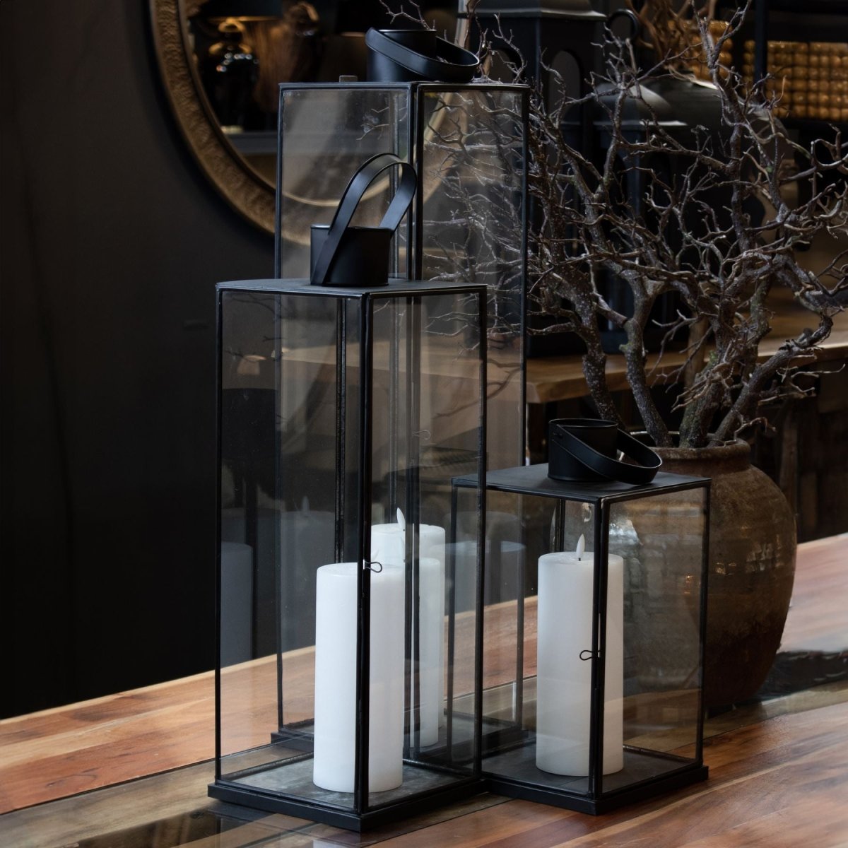 This is the Flat Top Medium Black Lantern. This stylish black metal lantern is a contemporary style statement that will add not ambience and interest to a space. Additional sizes available in the same style for impactful staggered height displays. Finish the look with one of our realistic LED wax candles.