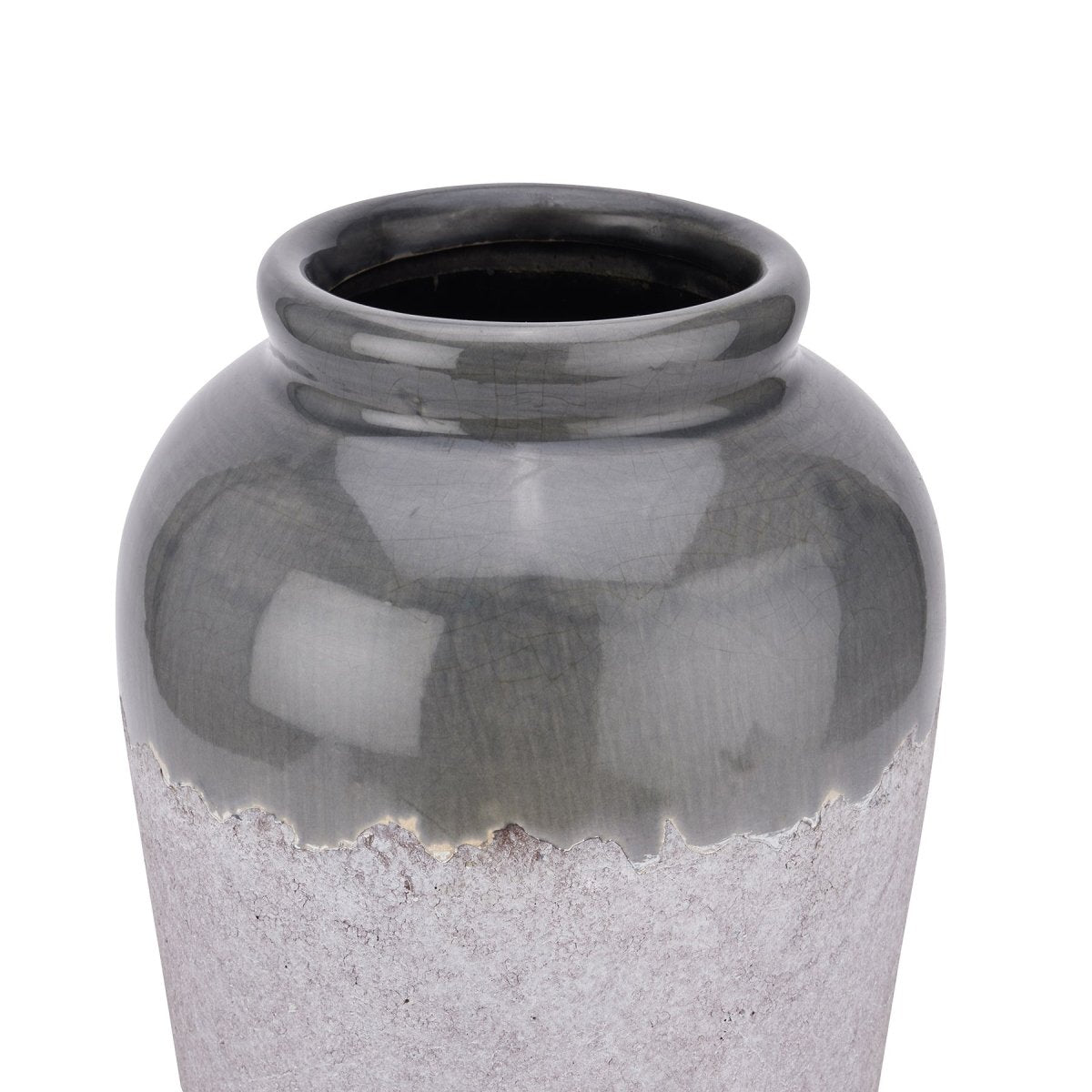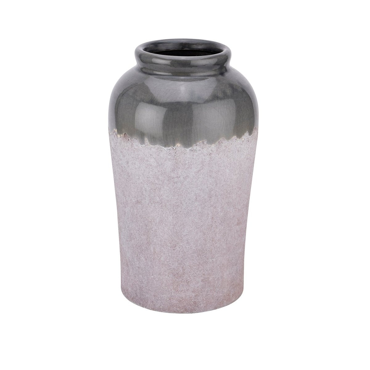 This is the Medium Conran Vase. A large vase suitable for floor standing with dual textured finish. A glossy deep blue/grey glaze feathers into a stone effect finish. The perfect vase for long stem floral arrangements.