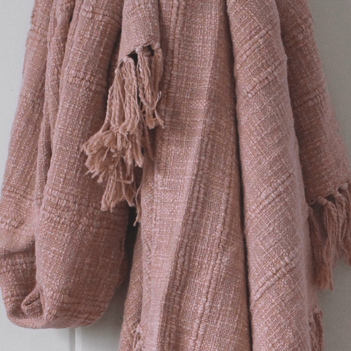 Wrap yourself in the cosy charm of the clay pink throw, a cotton blend creation with a woven finish and tasselled edge for added flair.