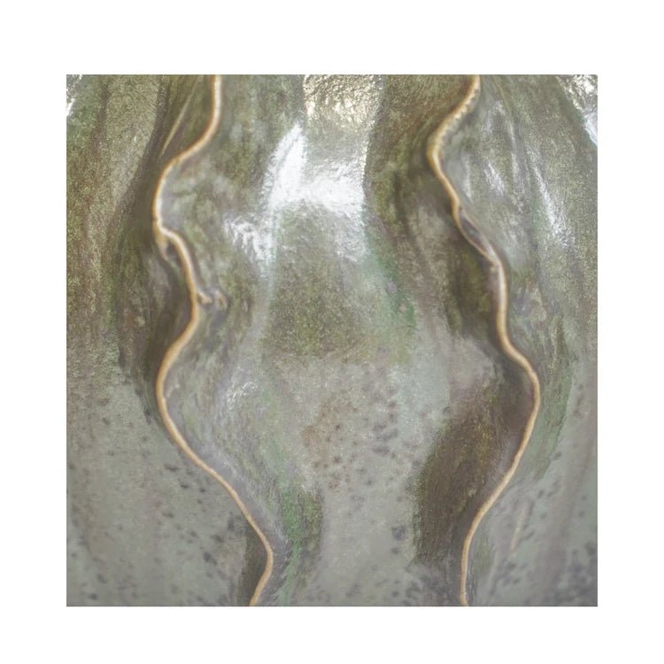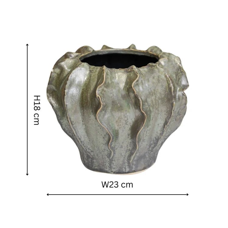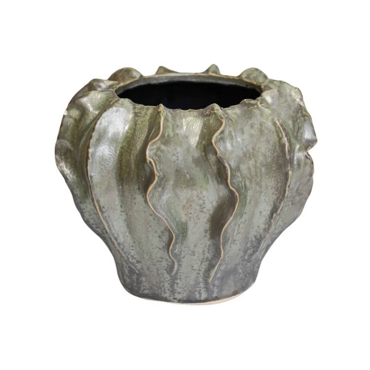 Scarlet Coral Reef Large Indoor Planter Green Ceramic - Wave-Like Texture, Pearlescent Glaze