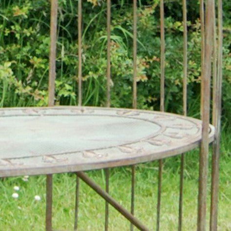 Crafted from a durable steel blend, its arched, wigwam-inspired design creates an inviting focal point while offering a practical seating area for two or three. The green rust finish exudes a natural, weathered elegance, blending seamlessly with garden greenery and floral blooms.