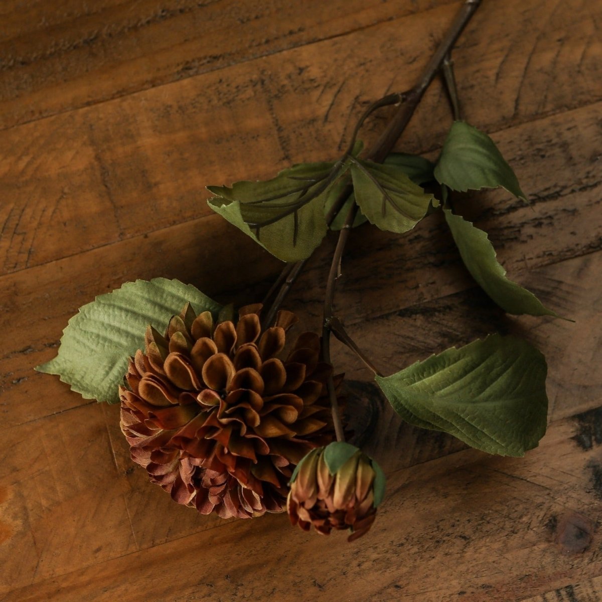 A deep, rich, mustard faux dahlia that will elegantly elevate any floral arrangement with its intricate, ball shaped petal formation.