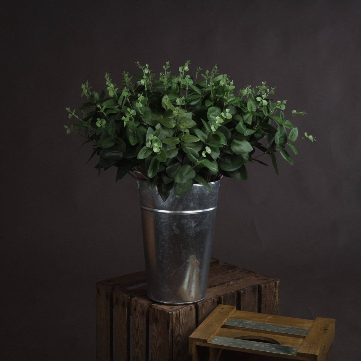 Short stem dark green cineraria eucalyptus spray.
