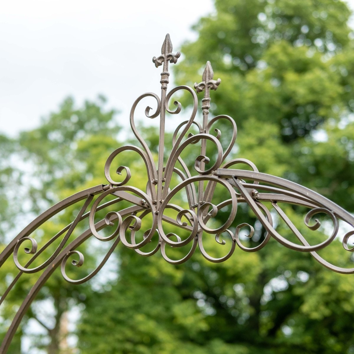 Crafted for outdoor use, its ornate scrollwork and steel blend construction combine durability with artistic detail, making it a striking focal point. Whether framing an entrance or defining pathways, the rustic look complements lush greenery and floral landscapes.