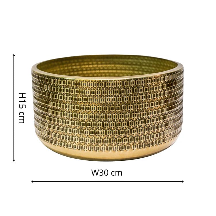 Elevate your indoor greenery game with this handcrafted indoor planter bowl. A striking gold-tone embossed pattern dances across the steel metal surface, adding eye-catching texture and a touch of luxe to your living spaces. Whether you opt to display vibrant fresh houseplants or lush faux stems, the waterproof and UV-stable design is ideal for seamlessly blending nature with your interior decor. Crafted by skilled Indian artisans, this indoor plant bowl lends an organic, upscale vibe that instantly enriches any room-from the living room to the home office or bedroom. A perfect gift for plant lovers and design enthusiasts alike, it's a low-maintenance yet high-impact centrepiece that brings the beauty of the outdoors in. Embrace your love of greenery and natural accents with this durable, versatile indoor flower bowl planter.